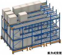 重力式貨架是在貨架上配置輥筒裝置,坡度在3度左右,利用貨物的自重達到貨物的進取,托盤從進口自動滑行至另一端的取貨口,重力式貨架是一種先進先出的貨架。